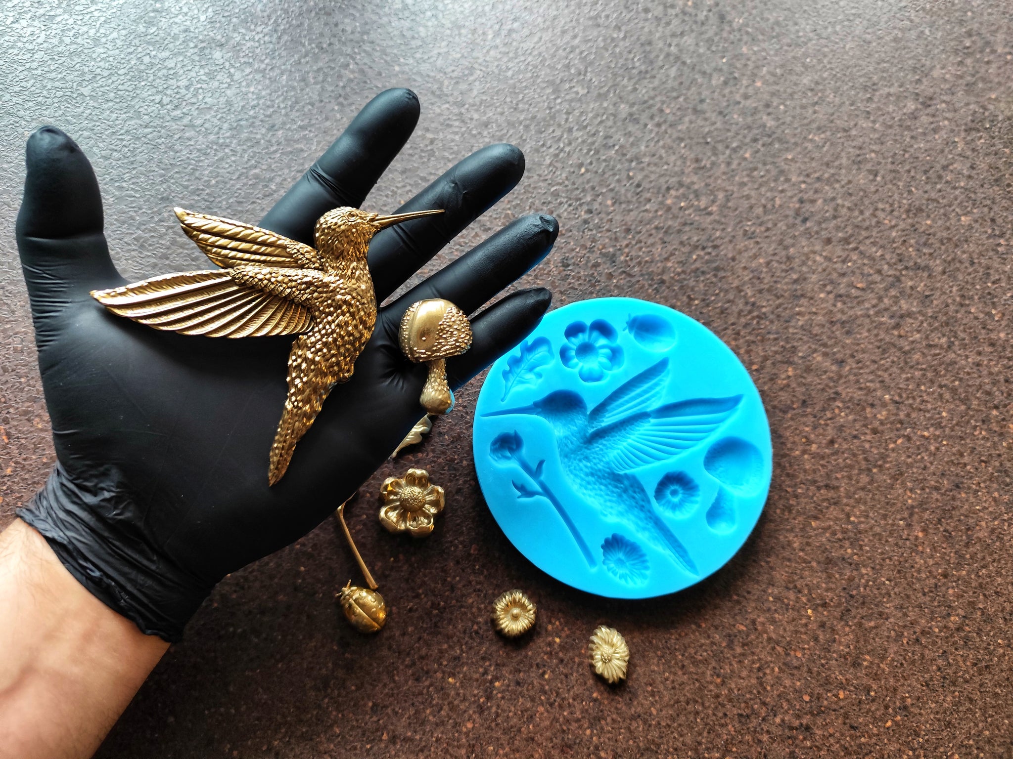 Silicone mold with a hummingbird, ladybug and plants